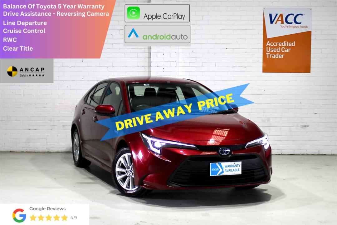 At our VACC-accredited used car dealership, we personally handpick all our vehicles and professionally detail them to ensure they are in immaculate condition inside and out. This 2023 Toyota Corolla Hybrid is no exception and has been extremely well looked after, making it the perfect choice for your next car.