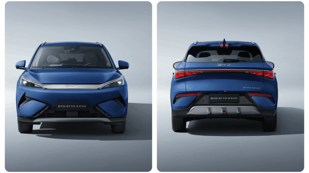 The BYD Atto 3 RWD variant retains the familiar compact SUV styling with subtle refinements expected in wheels and trim. Its design continues to prioritise urban usability while maintaining a modern EV aesthetic.