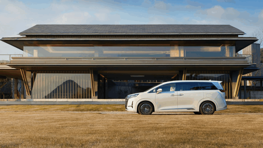 The Denza D9 adopts a bold MPV stance with a large grille, chrome detailing, and a long wheelbase designed to maximise interior space. Its upright proportions and premium styling cues position it as a luxury people mover rather than a traditional family van.